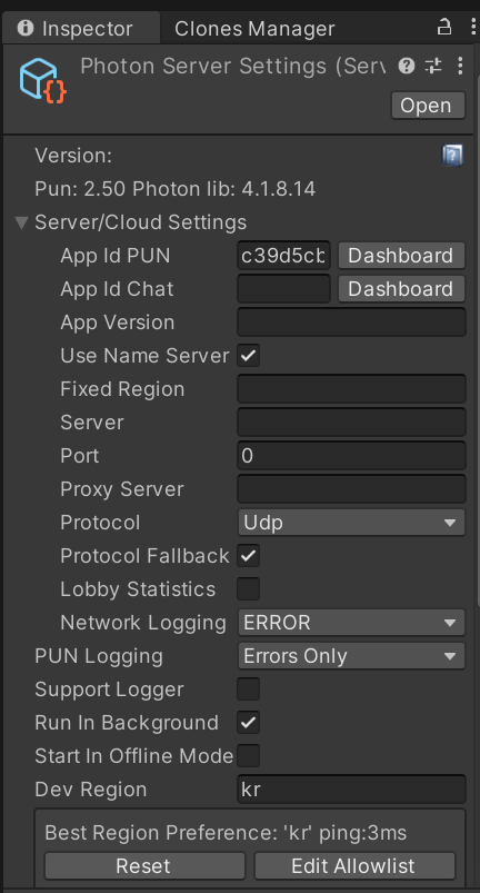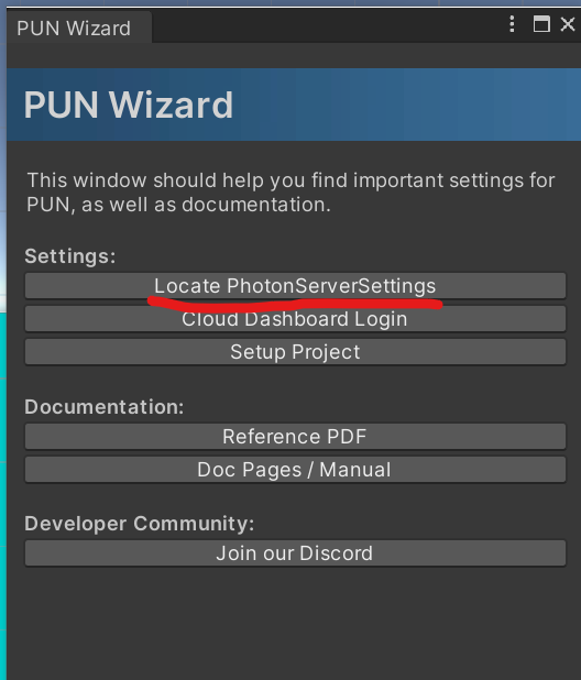 PUN Wizard에서 Locate PhotonServerSettings를 누르면, 포톤서버 세팅 스크립터블 오브젝트 파일로 연결된다.
