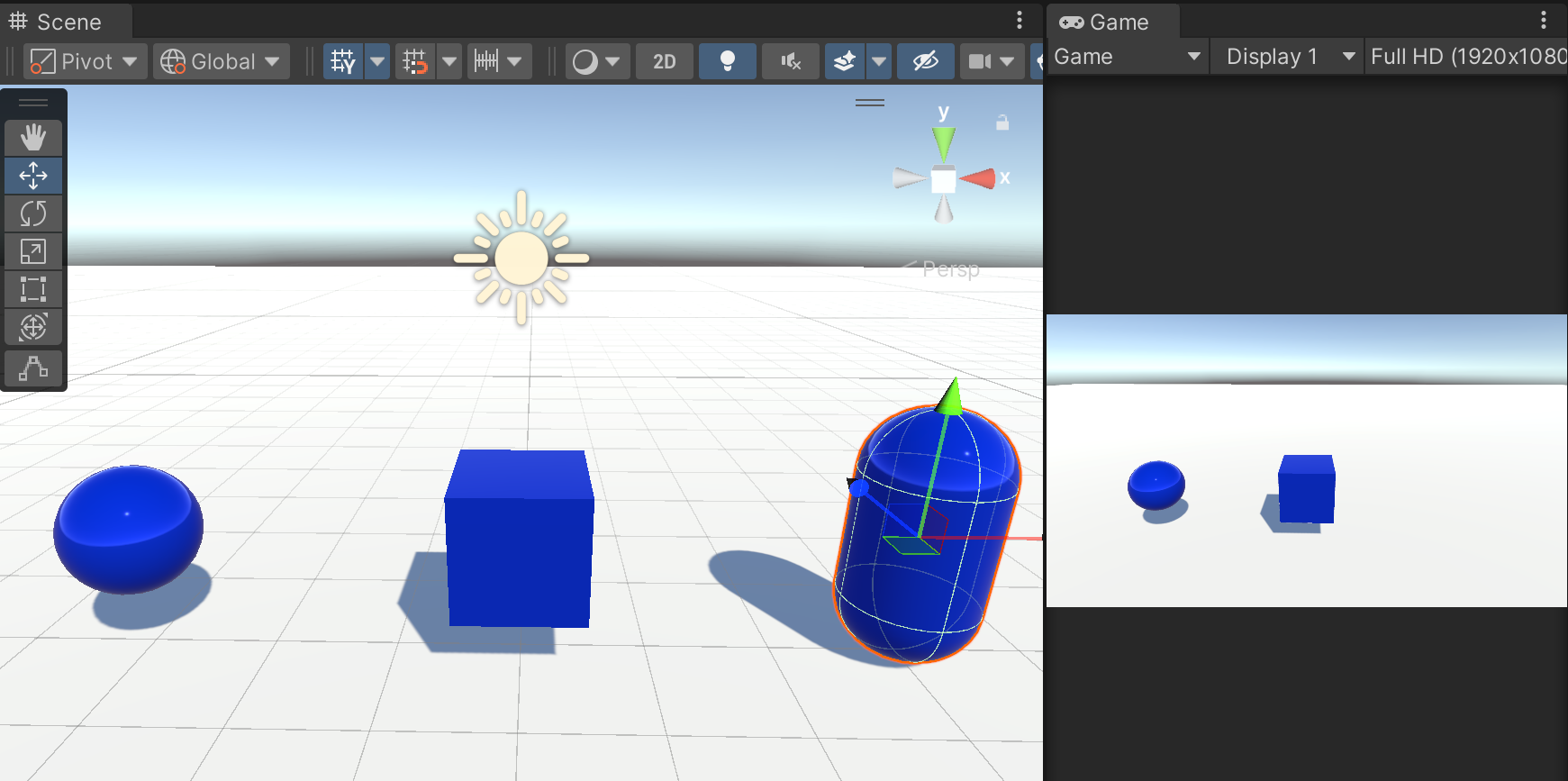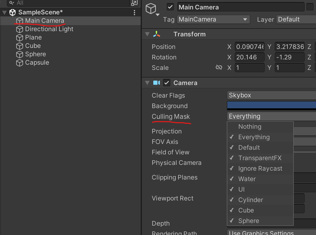 Culling Mask에서 표시할 레이어들만 선택할 수 있다. 여기서 큐브, 스피어만 체크하고 실린더는 체크 해제 해본다