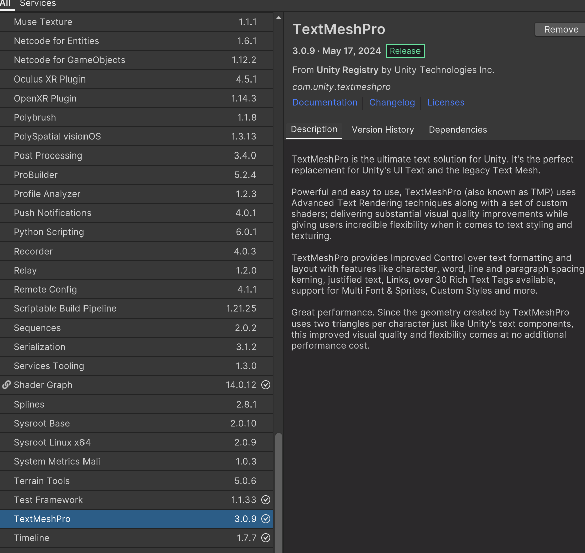 TextMesh Pro. UI로 텍스트를 쓸 일이 많기 때문에 추가.
