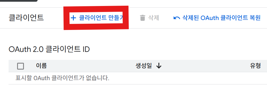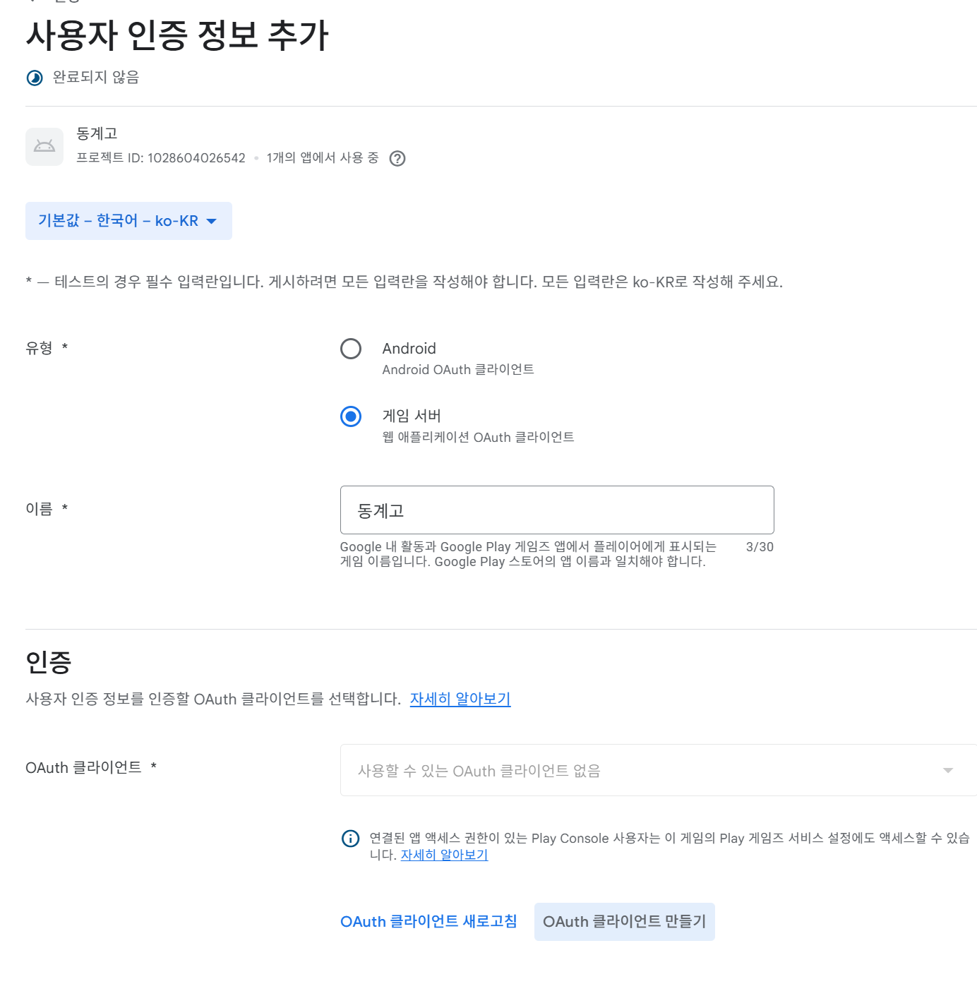 먼저 게임 서버를 진행한다. 정보들을 입력하고, OAuth 클라이언트 만들기 를 클릭한다.