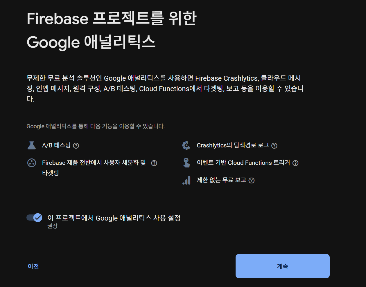 모바일 프로젝트에서는 PC와 달리 Analytics를 이용할 수 있다. 생성하는 방법은 이전의 파이어베이스 포스트를 참고하자.