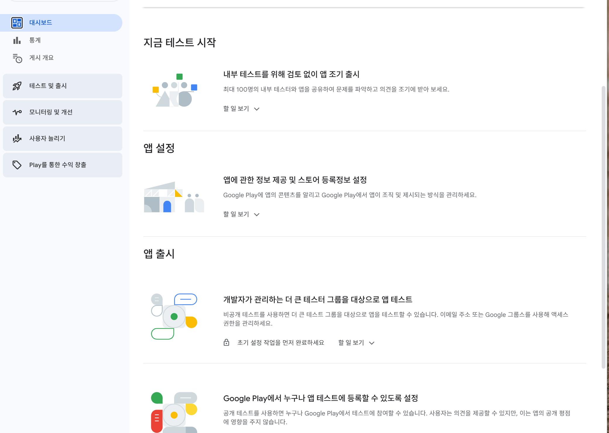 안드로이드 앱 개발자 전용 페이지다. 어플을 출시할 때 까지 여기서 모든 설정이 이루어진다.
