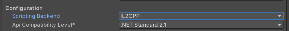 호환성을 위해 스크립팅 백엔드는 IL2CPP로 한다.