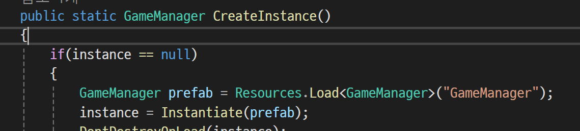 Instance를 호출 할 때, 인스턴스가 없을 경우 생성하도록 한다.게으른 초기화다// 씬 메니저 네임스페이스를 추가해야 된다