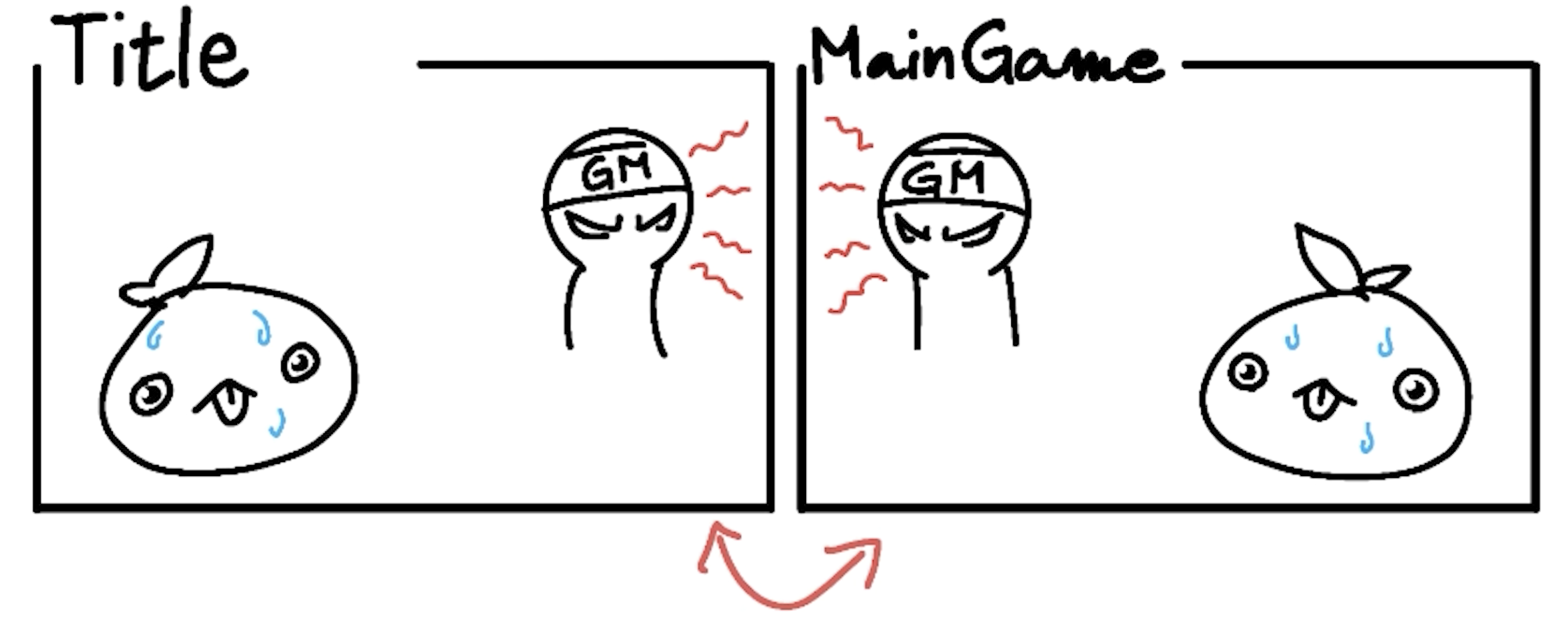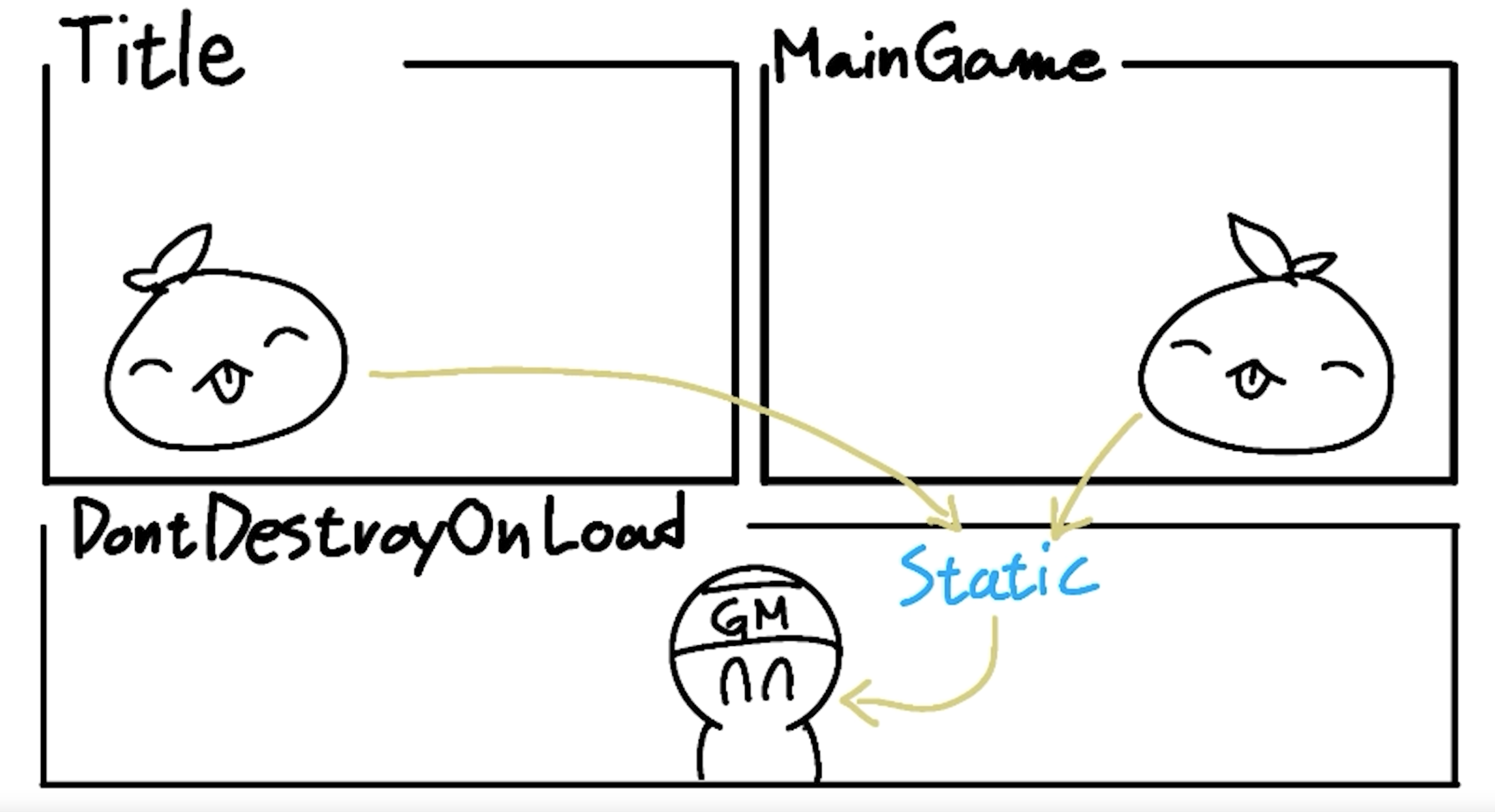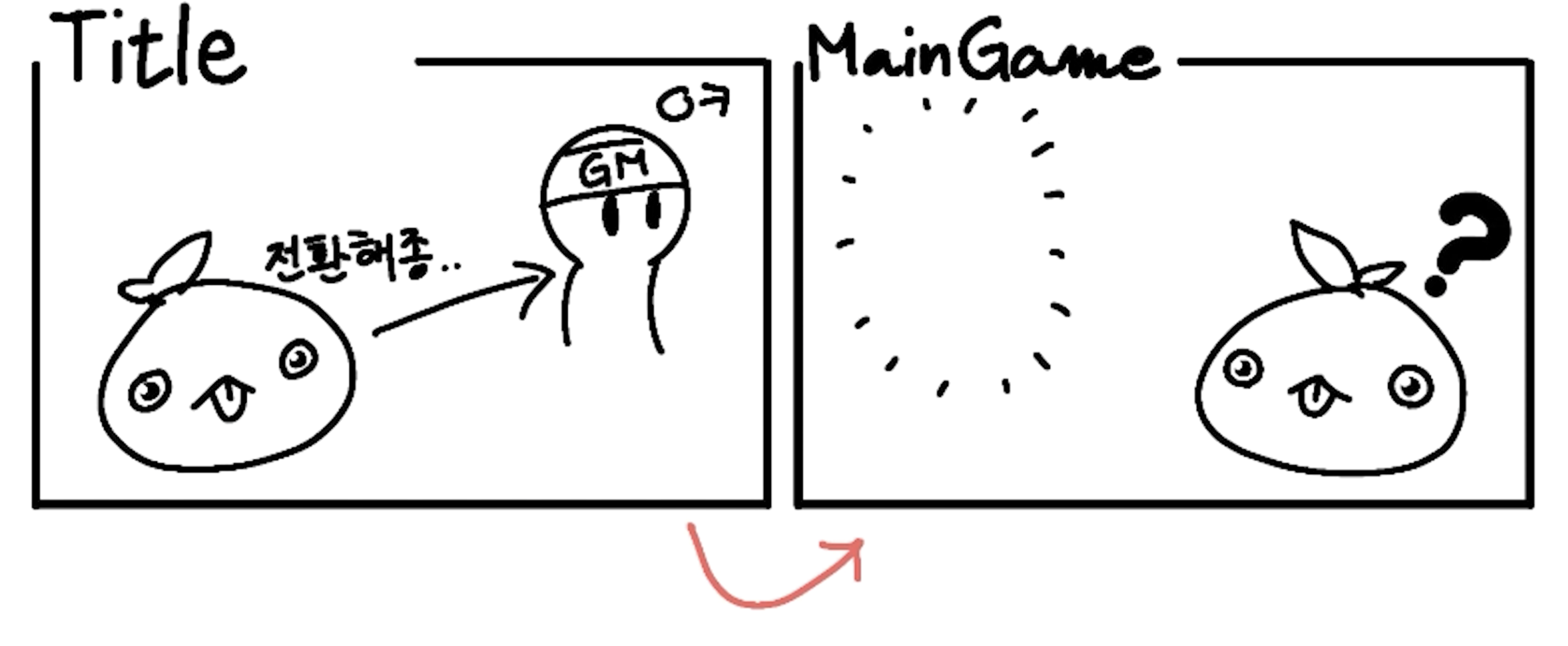 DontDestroyOnLoad()로 삭제가 막히지 않는다면, 다음 씬으로 변경 시 게임매니저가 존재하지 않아 참조 해야 할 인스턴스가 없다