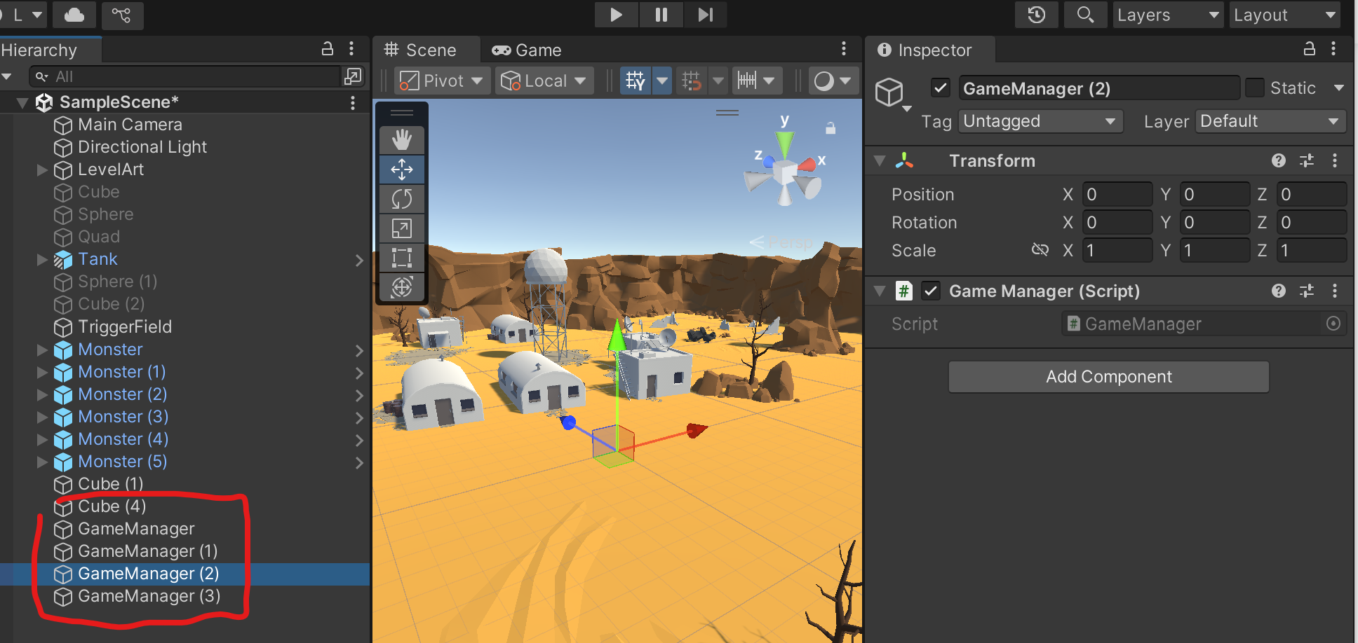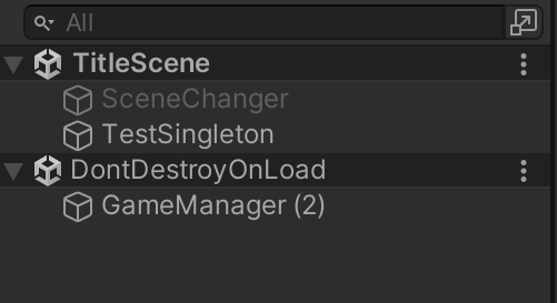 GameManager(3)만 남은 이유는 유니티에서 Awake()는 랜덤하게 순서가 진행되서 그렇다. 실행 할 때마다 살아남는 오브젝트가 달라진다