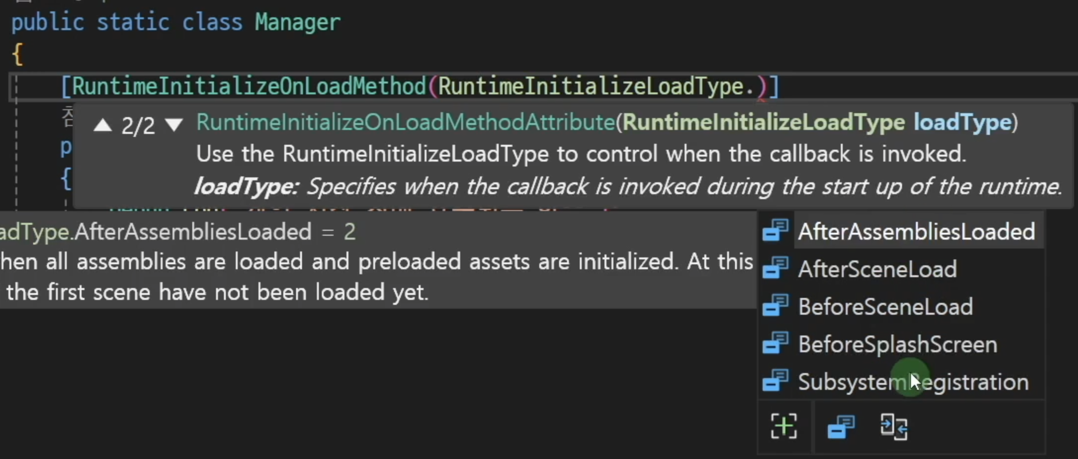 게임매니저 등의 오브젝트를 Awake() 보다 먼저 생성하게 하고 싶을 경우 쓸 수 있는 방법이다