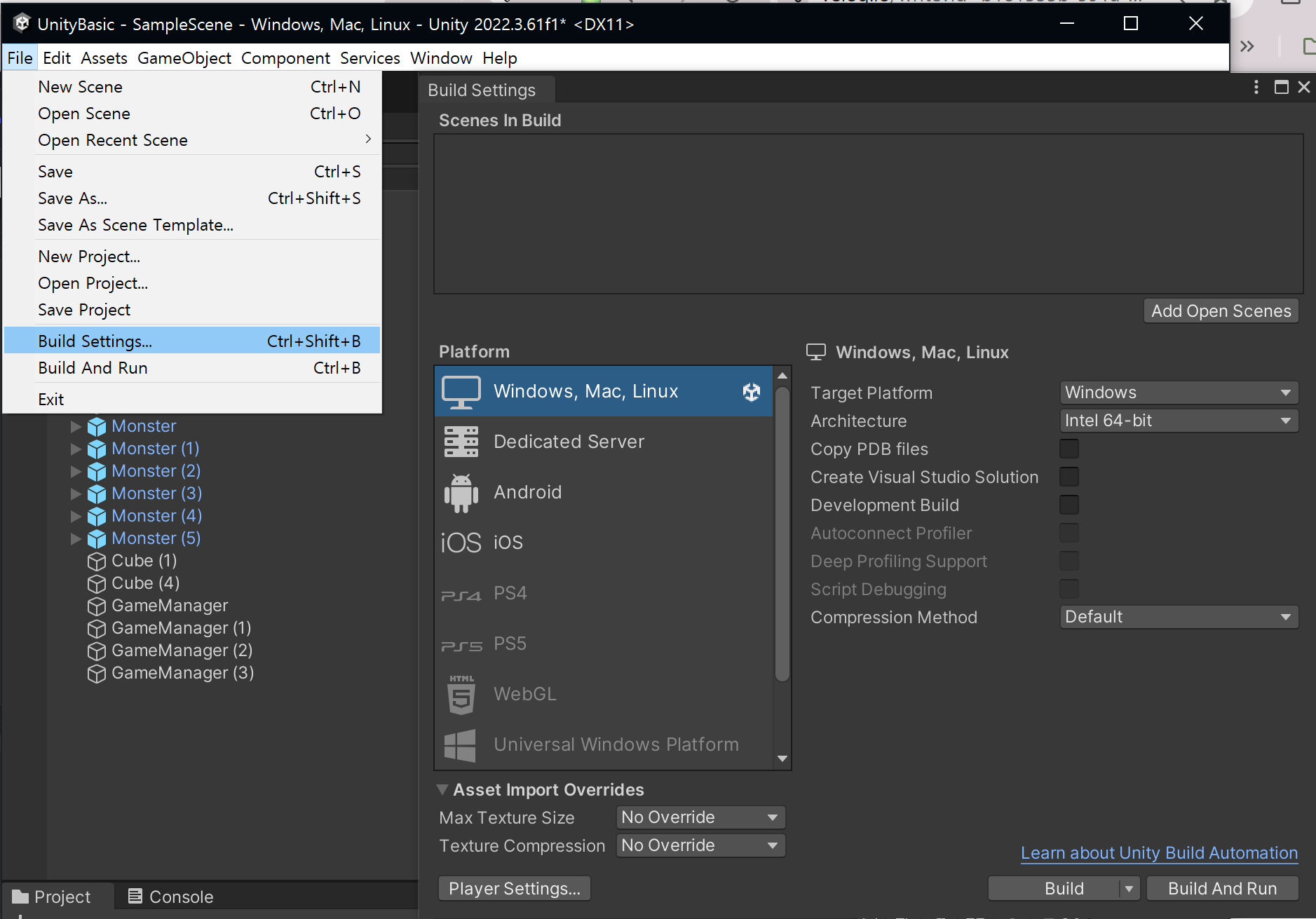 게임을 빌드할 때, 원하는 씬만 넣을 수 있다. 하이라키에서 씬을 드래그&드롭 하면 된다
