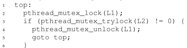 이런 상황을 피하기 위해 pthread_mutex_trylock 같은 함수가 있는데, lock을 가질 수 없을 때 대기하지 않고 바로 반환된다. 반환된 후 가지고 있던 lock의 선점도 포기한다.