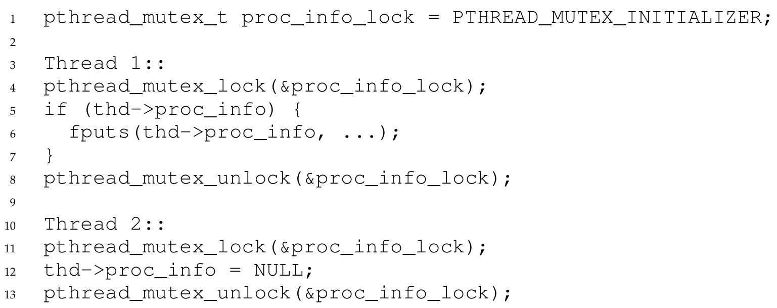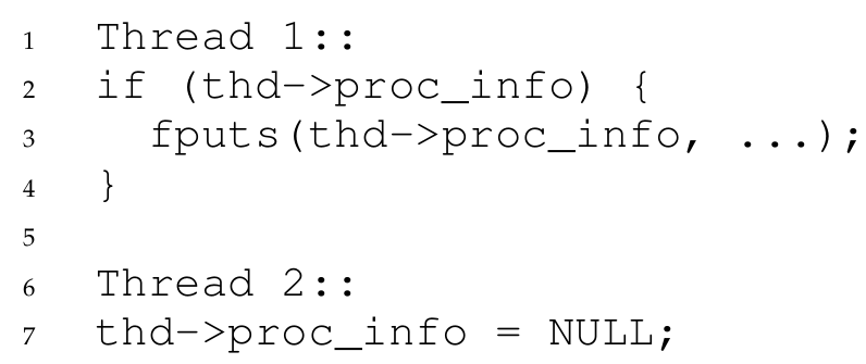 위 코드에서는 Thread 1이 proc_info 가 null이 아닐 때 값을 할당하고, Thread 2는 proc_info 의 값을 null로 변경하고 있다.