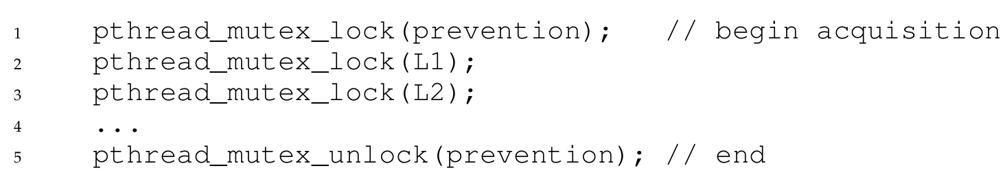 위 예시에서 prevention 이라는 lock을 통해, L1 혹은 L2 를 획득했을 때 interrupt가 발생하여 deadlock이 유발될 만한 상황을 예방한다.