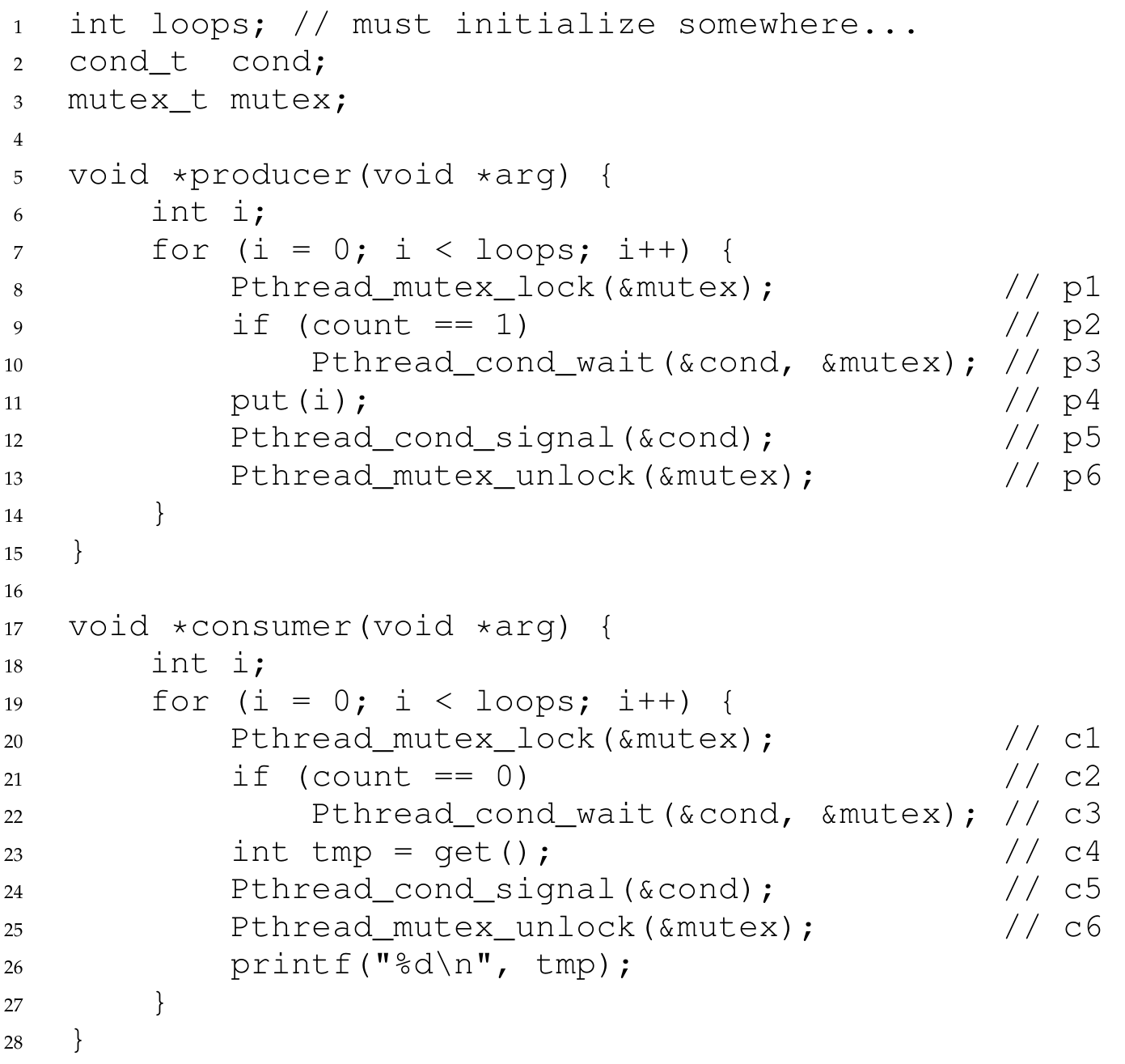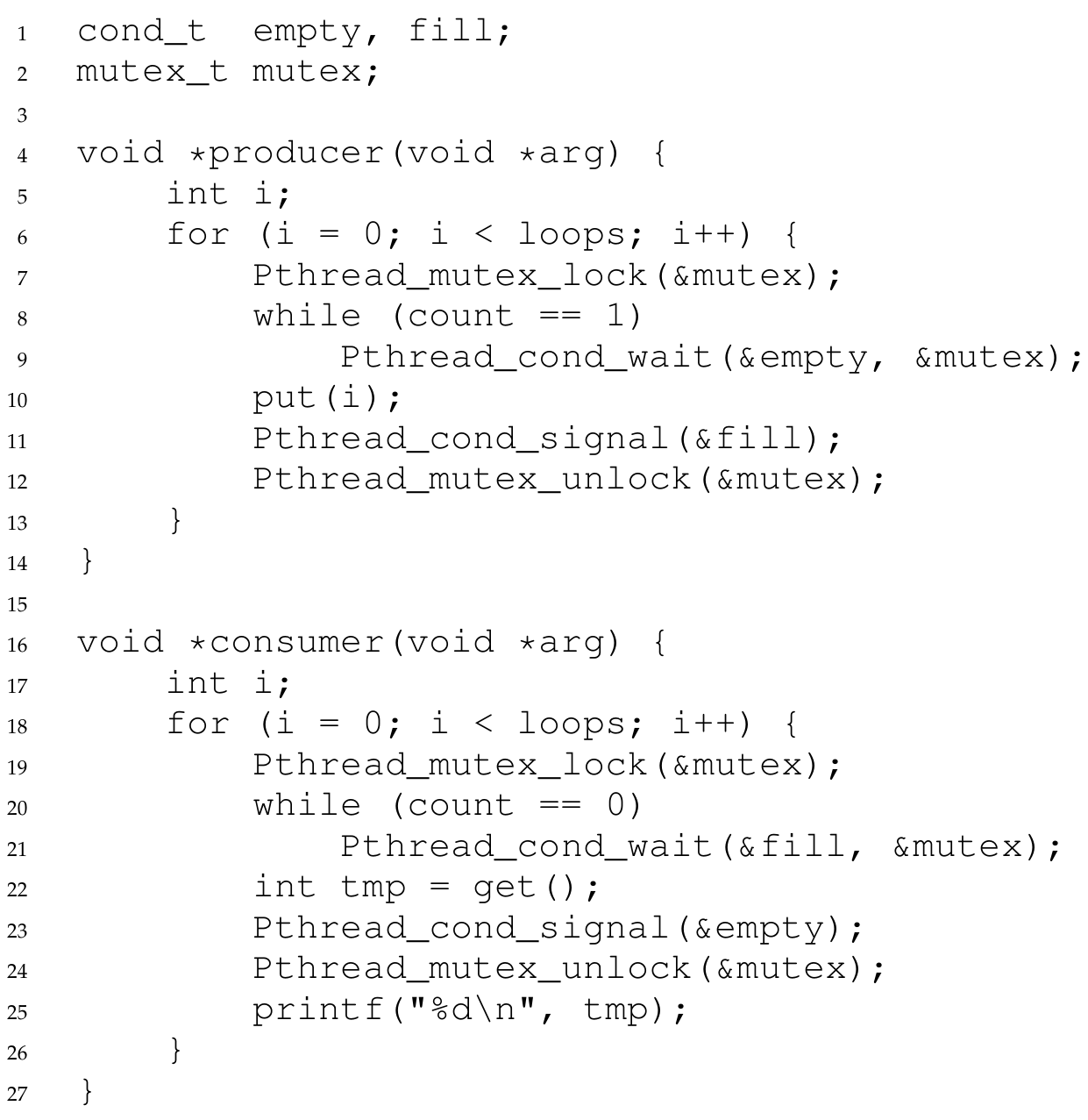 위 문제를 해결하기 위해 조건 변수를 여러개 사용할 수 있다. 생산자는 empty 에 대기하고, fill 에 signal 을 호출하며, 소비자는 fill 에 대기하며, empty 에 signal 을 호출한다.
