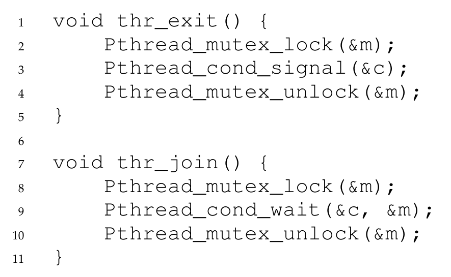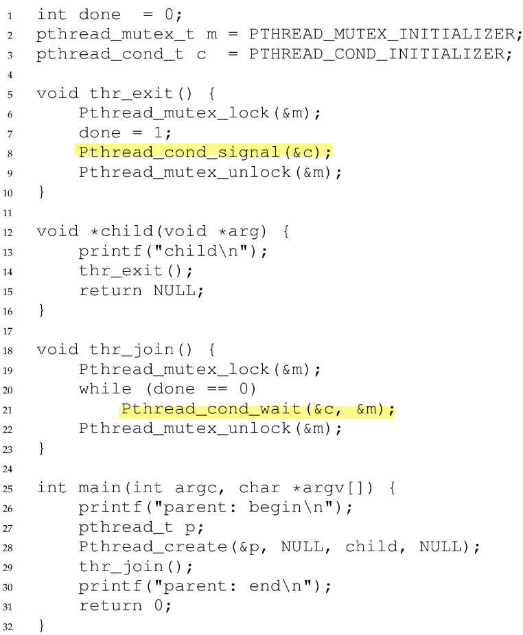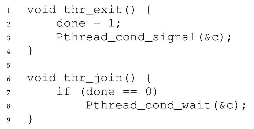 만약 여기서 done 이 사라지면 어떻게 될까? 이러면 제대로 동작하지 못한다. 왜냐면 자식 스레드가 먼저 thr_exit 을 실행하면, 아무것도 깨우지 않고 끝이나고, 부모 스레드가 thr_join 을 뒤이어 실행하면서 영원히 잠들기 때문이다.