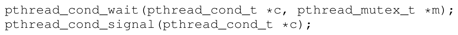 이 기능의 예시로 POSIX의 pthread_cond_wait 와 pthread_con_signal 이 있는데, 두 함수 모두 파라미터로 조건 변수를 전달 받는다.