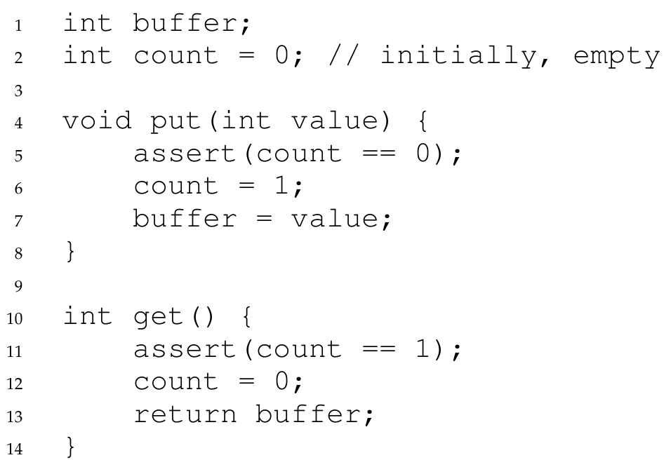 위 예제의 put 함수와 get 함수는 각각 buffer 상태 변수에 값을 저장하고, count 변수를 기준으로 예외를 발생시킨다. (예상값과 다르면 assert 호출)