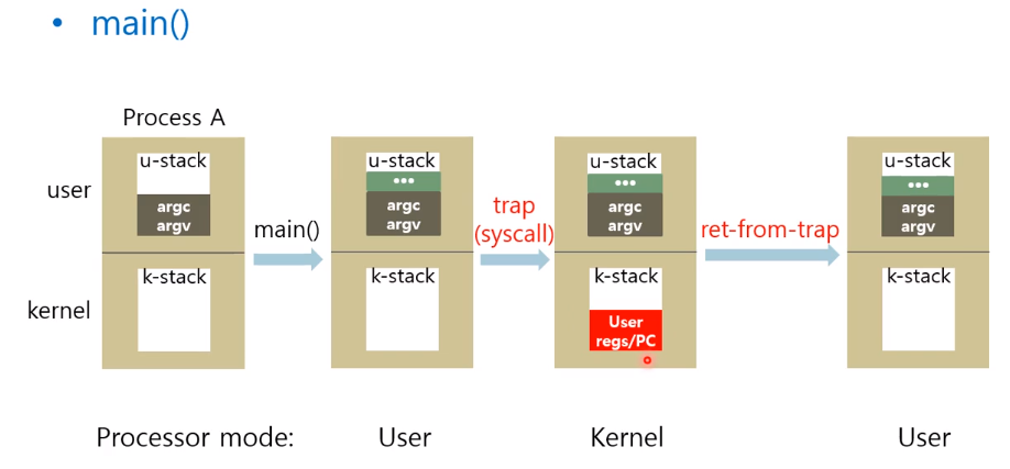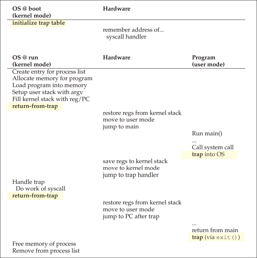 프로세스는 system call(trap instruction)을 통해 kernel mode에 진입할 수 있으며, 제한되던 작업을 실행 후 return-from-trap instruction을 통해 user mode로 복귀한다.