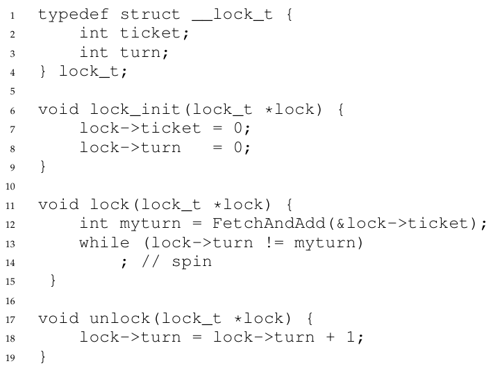 추후 unlock될 때 이 turn(lock→turn)값을 1 증가시키면서 다음 ticket들을 가지고 있는 스레드가 lock을 얻게 된다.