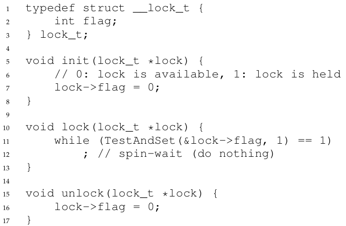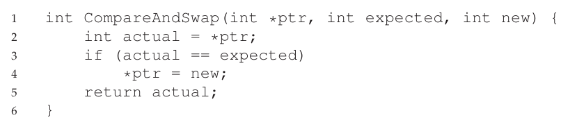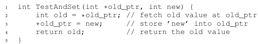 위 예시에서는 lock에 새로운 값을 할당하고 이전 값을 return 한다. 즉, 값이 1일 때는 계속해서 spin-wait 하며 똑같은 1이라는 값을 할당하고, 값이 0일 때는 새 값인 1일 할당하고, 이전 값인 0을 return 하여 spin-wait을 벗어난다.