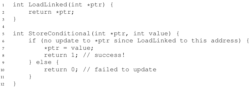 load-linked를 spin lock에서 계속 호출하며, 잠금이 확보(플래그가 0) 되기를 기다리고, 확보되면 store-conditional로 lock을 갱신(플래그 1로 설정)하려 시도한다.