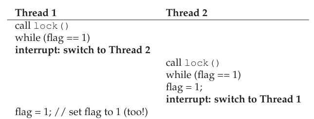 위 예시에서는 Thread 1이 flag를 1로 설정하기 전에 interrupt가 발생하여 Thread 2가 critical section에 진입하고 있다. 즉 mutual exclusion이 실현되지 않는다.