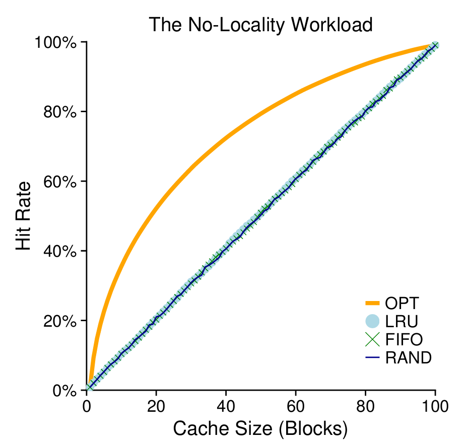 위 그래프를 통해 몇 가지 결론을 도출해낼 수 있다. 첫째로는 지역성이 없는 작업에는 어떤 정책을 사용하는지가 중요하지 않다는 것이다. LRU, FIFO, 랜덤 모두 동일한 성능을 보였다. 그러나 최적의 정책(미래를 내다보는 정책)에는 부족하다.
