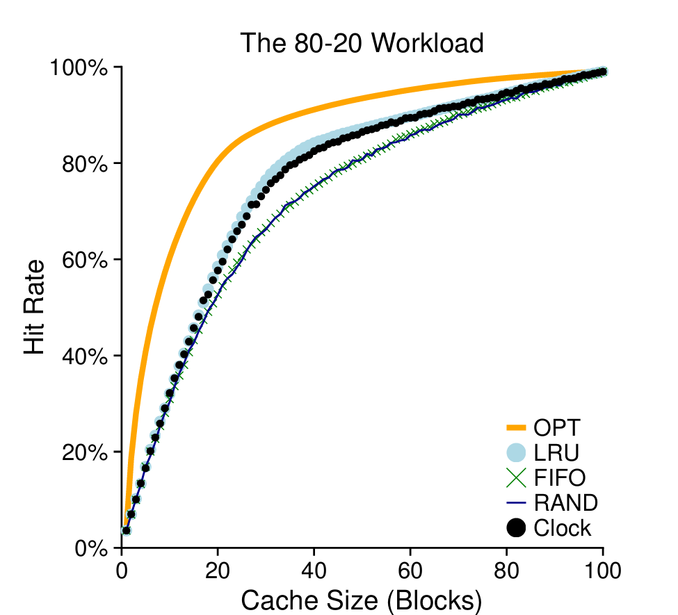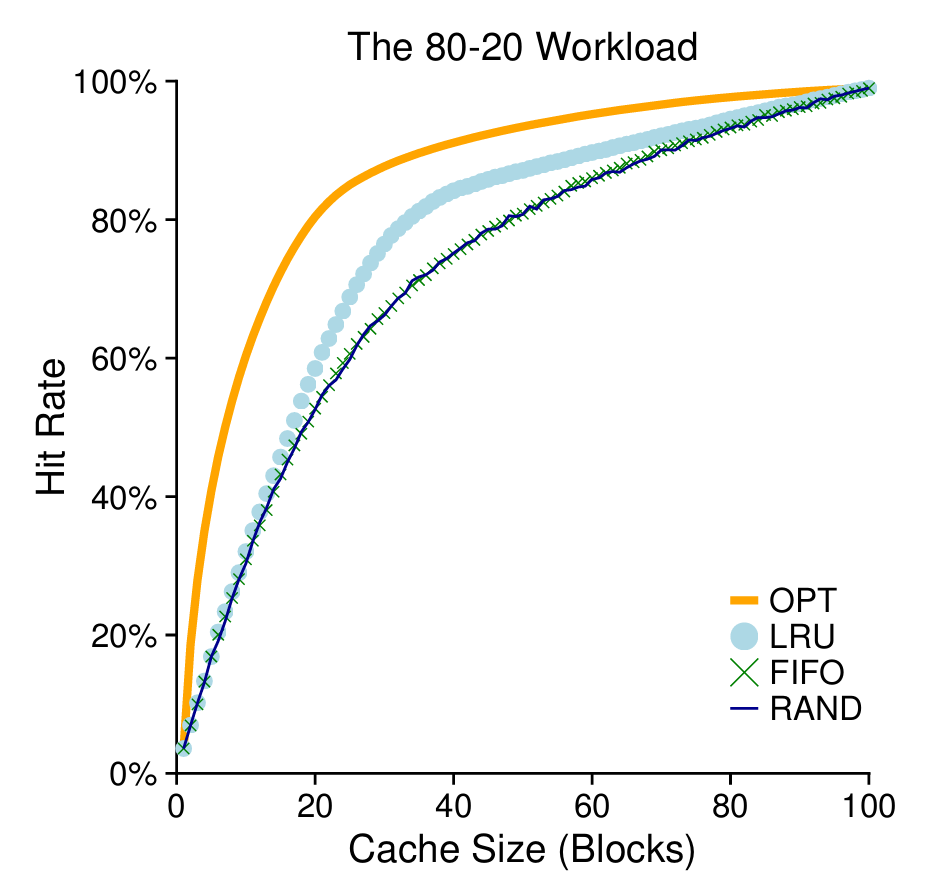 다음 그래프는 80%의 참조가 전체 페이지의 20%에만 이루어지는 경우이다. 이때는 랜덤과 FIFO의 성능이 비슷하지만, 미래에 다시 참조될 가능성이 높은 페이지를 보유하는 LRU의 성능이 더 우수하다.