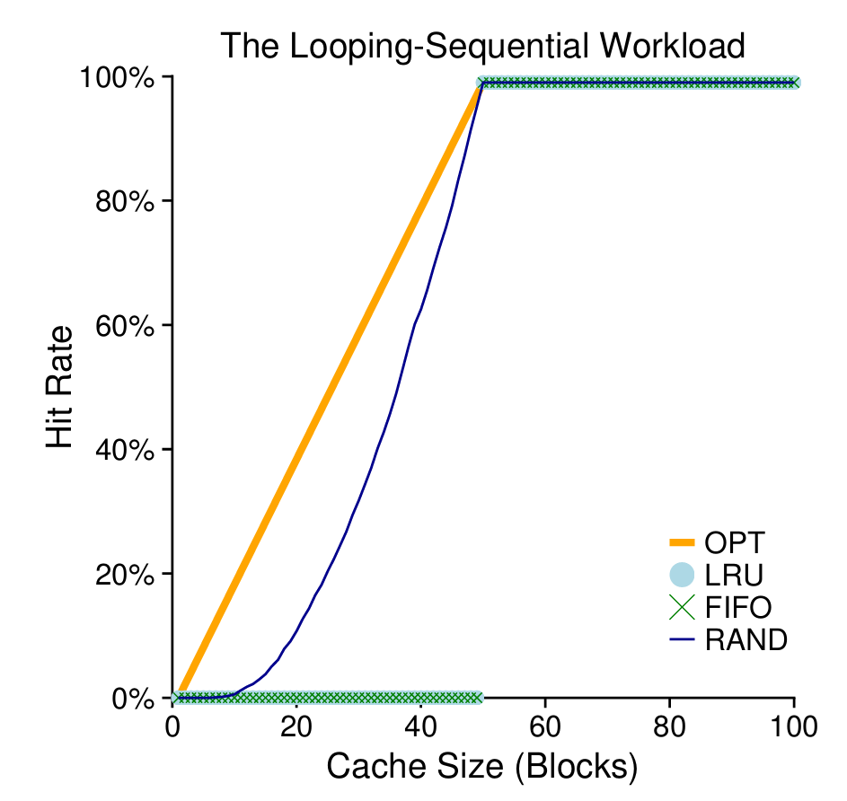 다음으로는 50페이지만 반복적으로 참여하는 작업이다. 이 경우에는 LRU와 FIFO 모두 최악의 경우를 나타낸다. 오래된 페이지를 제거하는데 특화된 정책들이 힘을 쓰지 못한다.