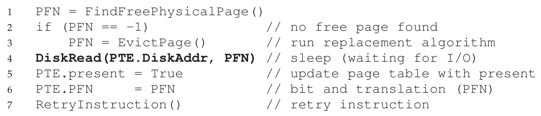 디스크 입출력이 완료되면 OS는 페이지 테이블을 업데이트하고, PTE의 PFN 정보를 업데이트한다. 이후 명령은 재시도 된다.