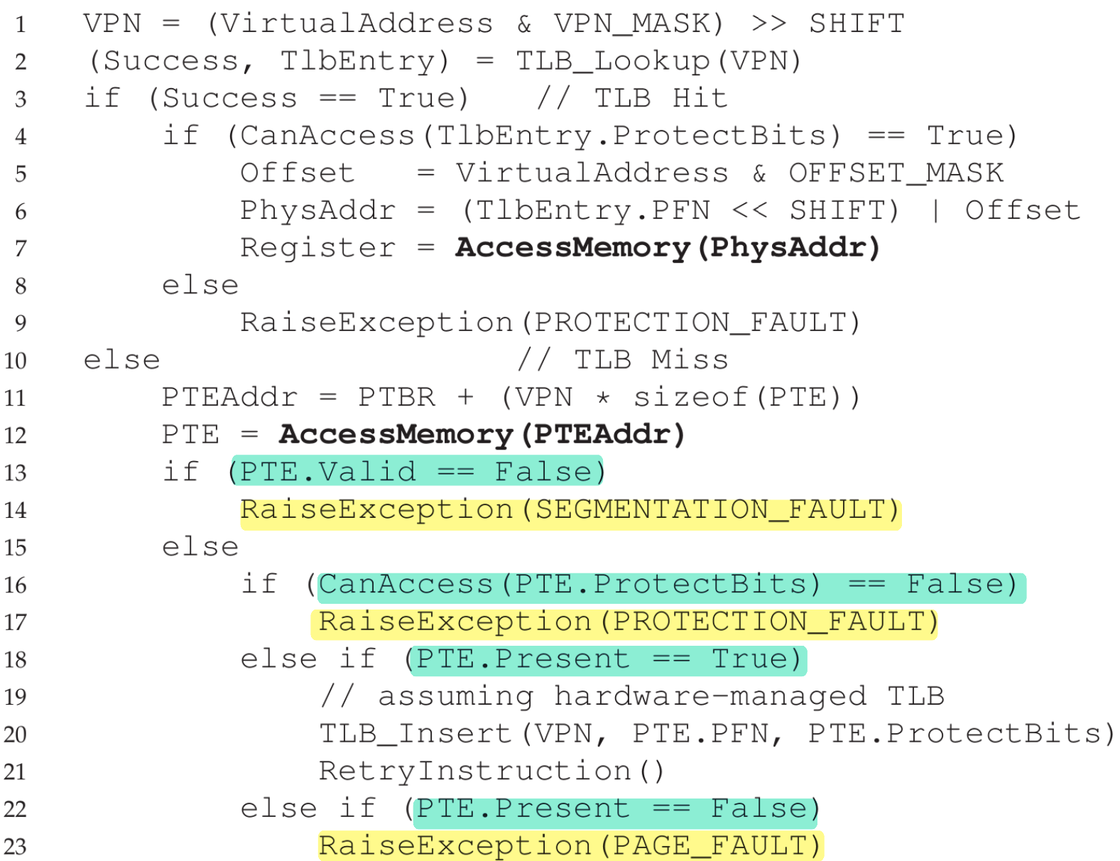 페이지가 존재하고 유효한 경우, PTE에서 PFN을 가져온 뒤 TLB를 갱신하고 재시도하여 TLB 히트로 이어진다.