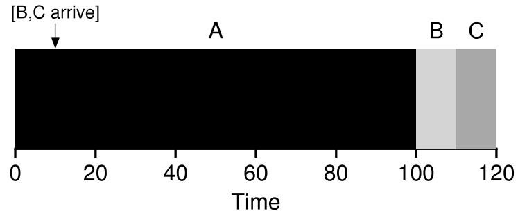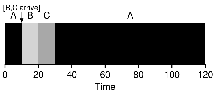 STCF에서 봤던 예시를 다시 확인해보면 A는 (0 - 0) = 0, B는 (10 - 10) = 0, C는 (20 - 10) = 10의 응답 시간을 보인다.