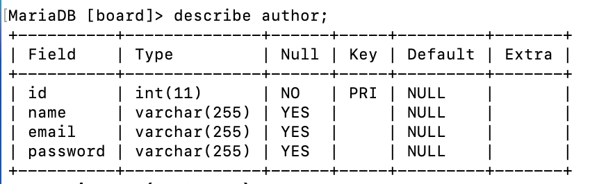 CREATE TABLE 테이블명(id INT PRIMARY KEY, name VARCHAR(255), email VARCHAR(255), password VARCHAR(255));