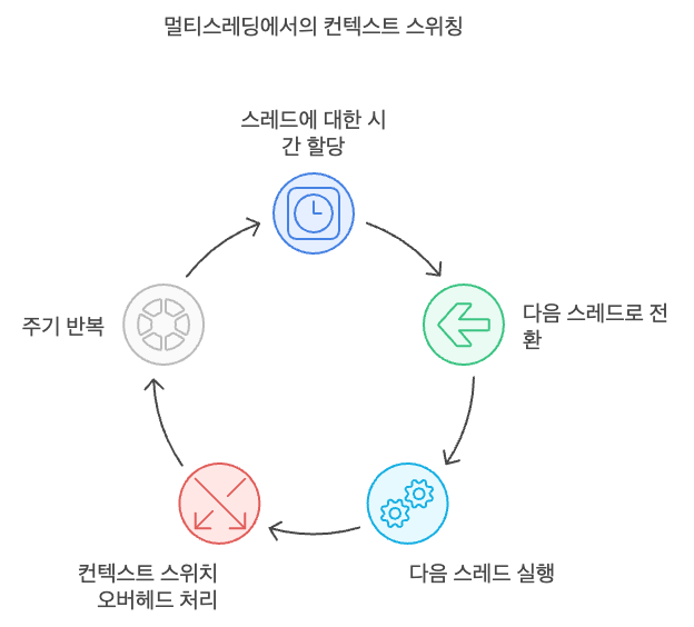멀티스레딩 환경에서는 여러 스레드가 동시에 실행되는 것처럼 보이지만, 실제로는 CPU가 각 스레드에 할당된 시간을 교대로 배분하는 방식으로 처리된다. 이 과정에서 컨텍스트 스위칭이 자주 일어나게 된다.