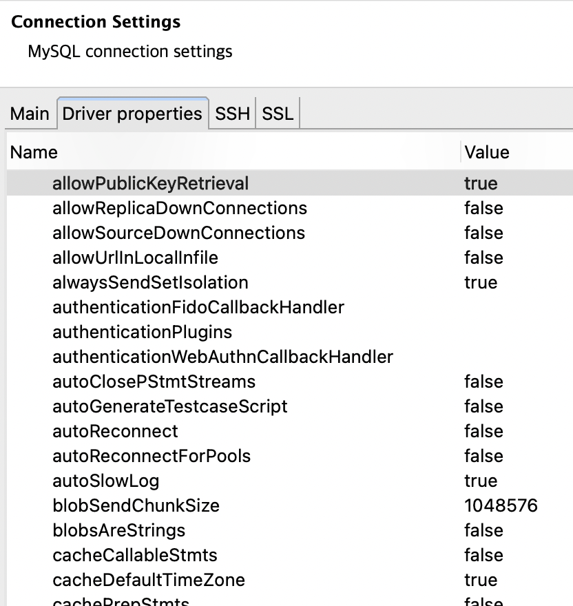 Connection Settings의 Driver properties들 중 일부를 다음과 같이 변경한다.