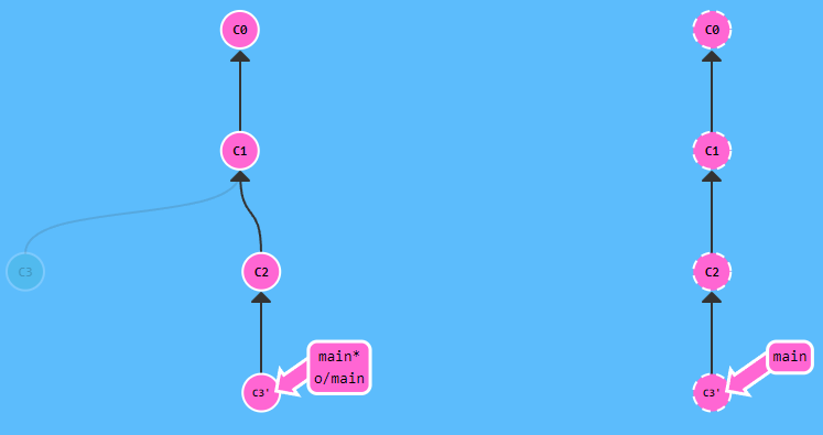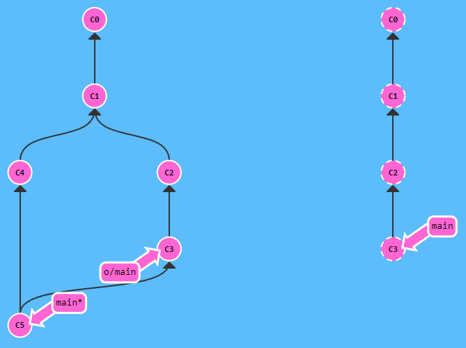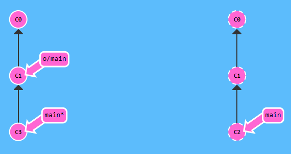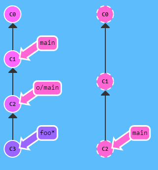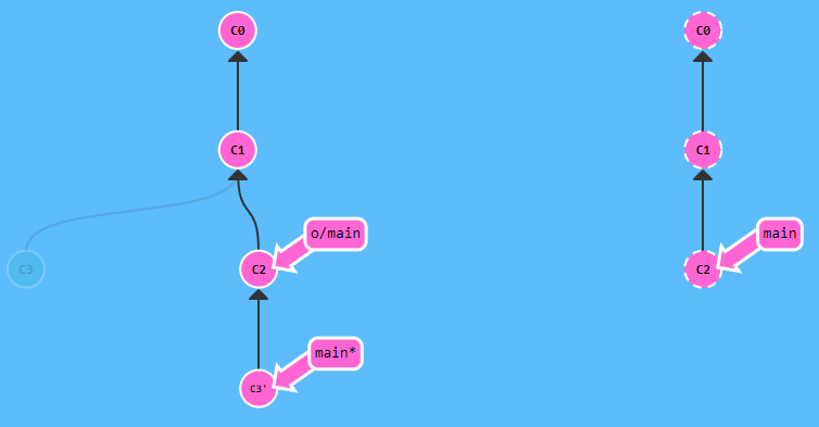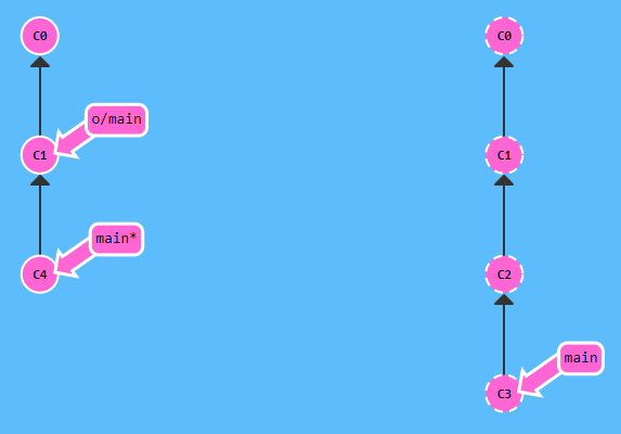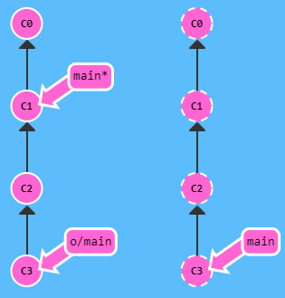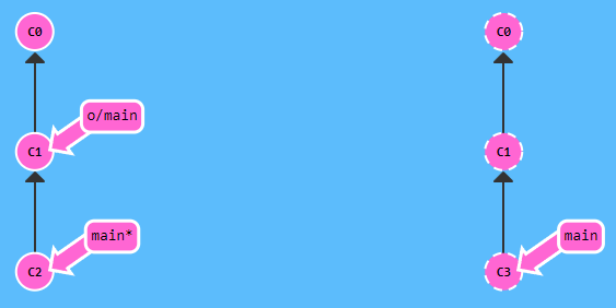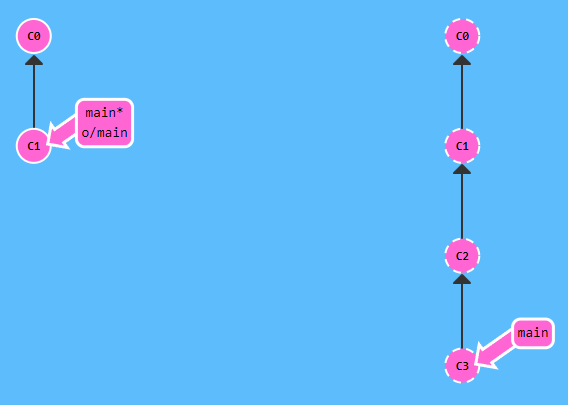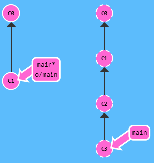커밋 C2 와 C3 가 우리의 로컬 저장소로 다운로드 되었고, 원격 브랜치 o/main 가 이것을 반영하기 위해 업데이트 되었습니다.