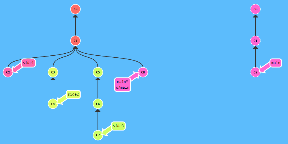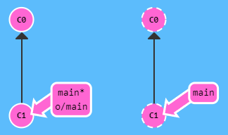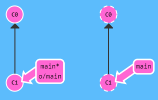 우리의 로컬 저장소에 o/main 라고하는 원격 브랜치가 생깁니다. (대부분의 개발자들은 자신의 주 원격 저장소를 origin 라고 합니다. 보통 origin/main 라고 되어 있지만, 여기서는 줄여서 o로 표현)