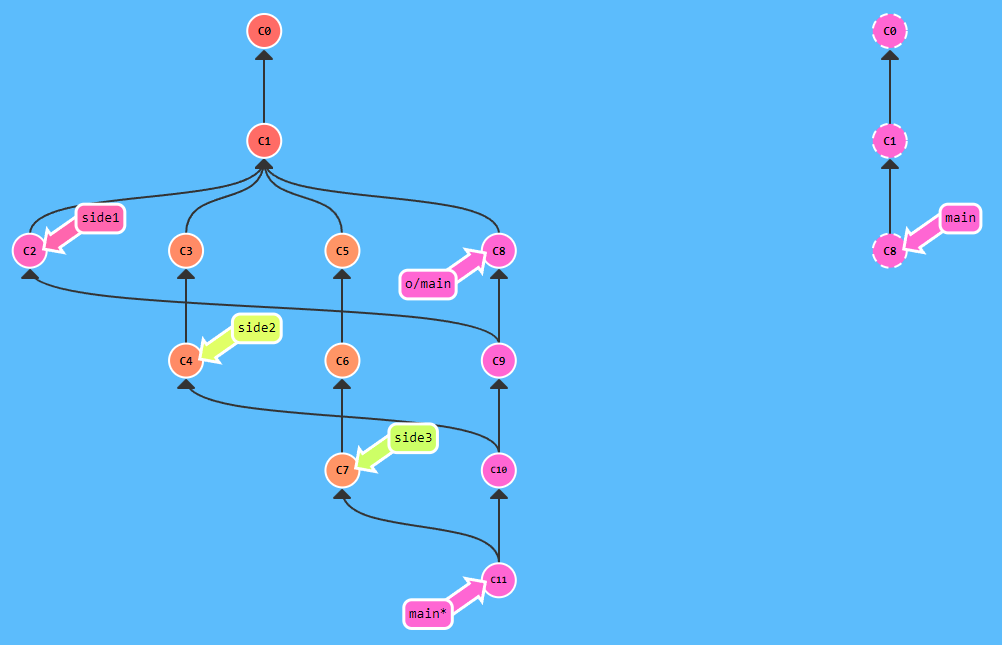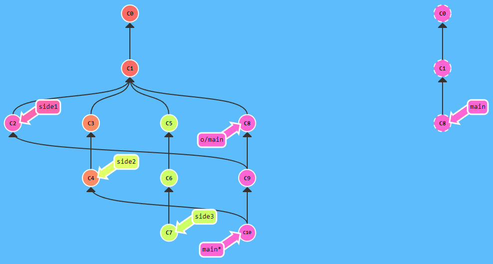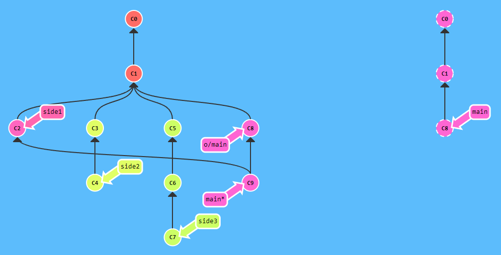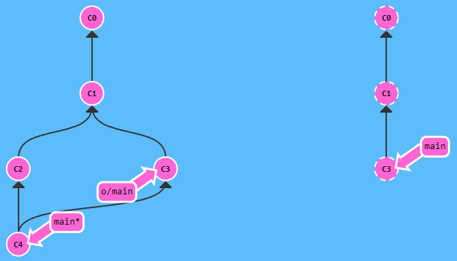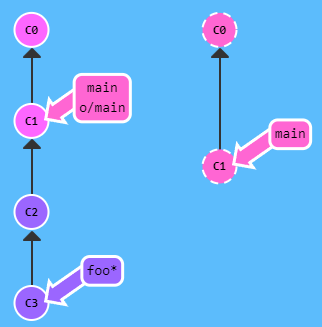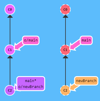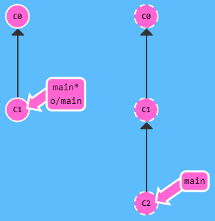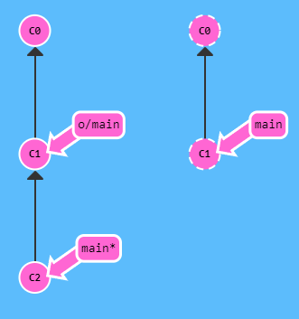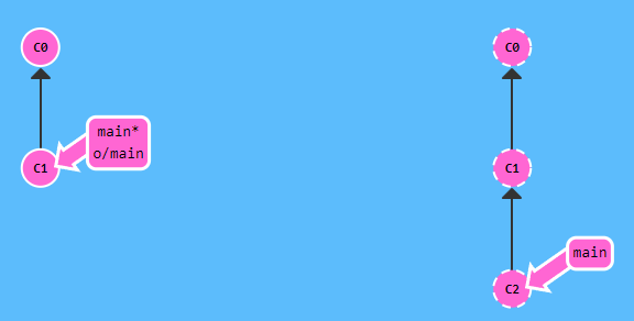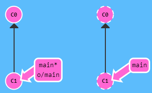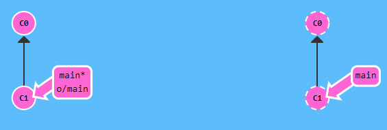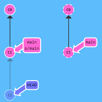 분리된 HEAD 모드로 만들고 새로운 커밋을 추가해도 o/main를 갱신하지 않습니다. 이것은 o/main가 원격 저장소가 갱신될때만 갱신되기 때문입니다.
