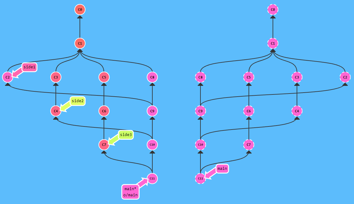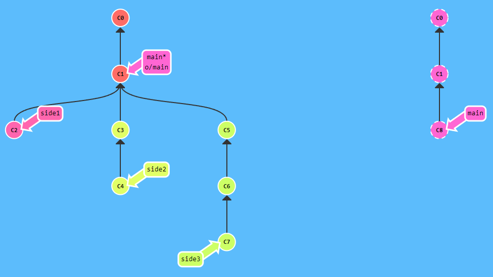 예를 들어, 커밋 C1는 과거의 C3로 rebase 될 수 있습니다. C1'의 작업이 C3의 다음에 있는것으로 보이게 되는겁니다. 실제로는 C1이 먼저 완료된거인데 말이죠.