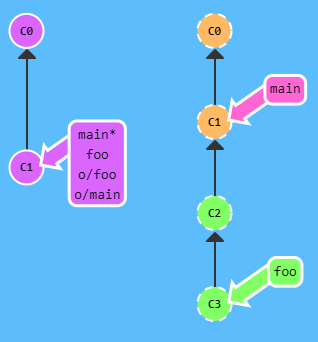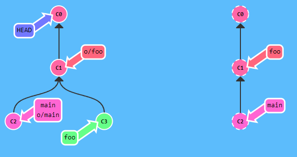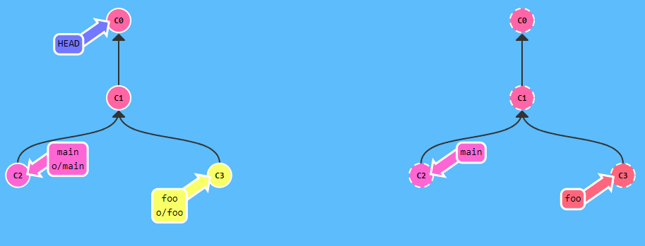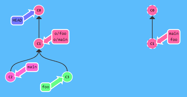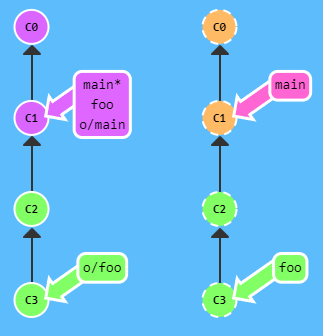 커밋들을 foo브랜치에서만 내려받은 후 로컬의 o/foo브랜치에만 적용합니다.