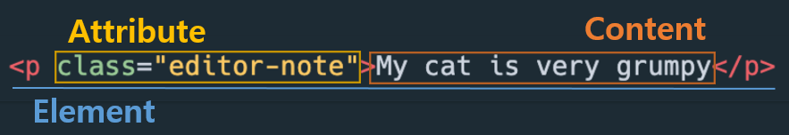 태그는 하나의 Element 이며, 태그 안의 내용을 Content 라고 합니다. 또한 Attribute 라는 속성값을 class로 정의할 수 있습니다.