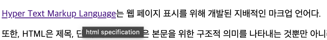 <p><a href="https://www.w3.org/TR/2011/WD-html5-20110405/index.html" target="_blank" title="html specification">Hyper Text Markup Language</a>는 웹 페이지 표시를 위해 개발된 지배적인 마크업 언어다.