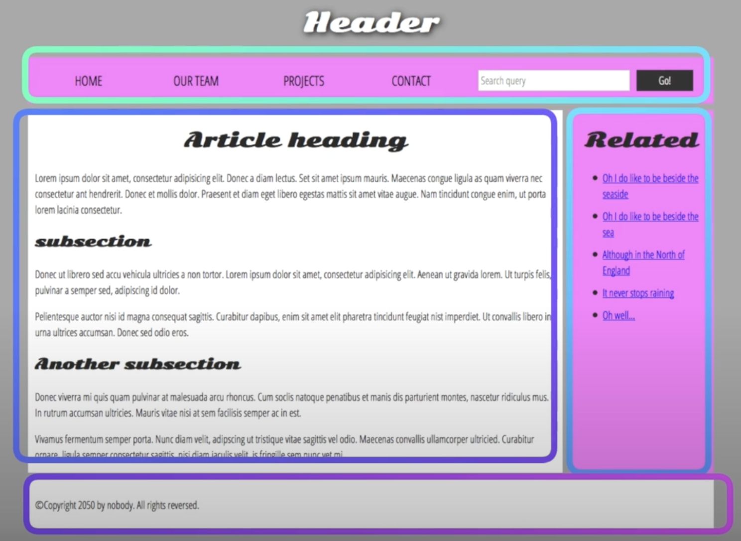 웹사이트의 구조를 간단하게 확인할 수 있는 문서입니다. body 태그 안에서도 header, navigation bar, main content, sidebar, footer 등의 구조로 나눌 수 있습니다. 물론 이 구조를 따르지 않아도 됩니다.