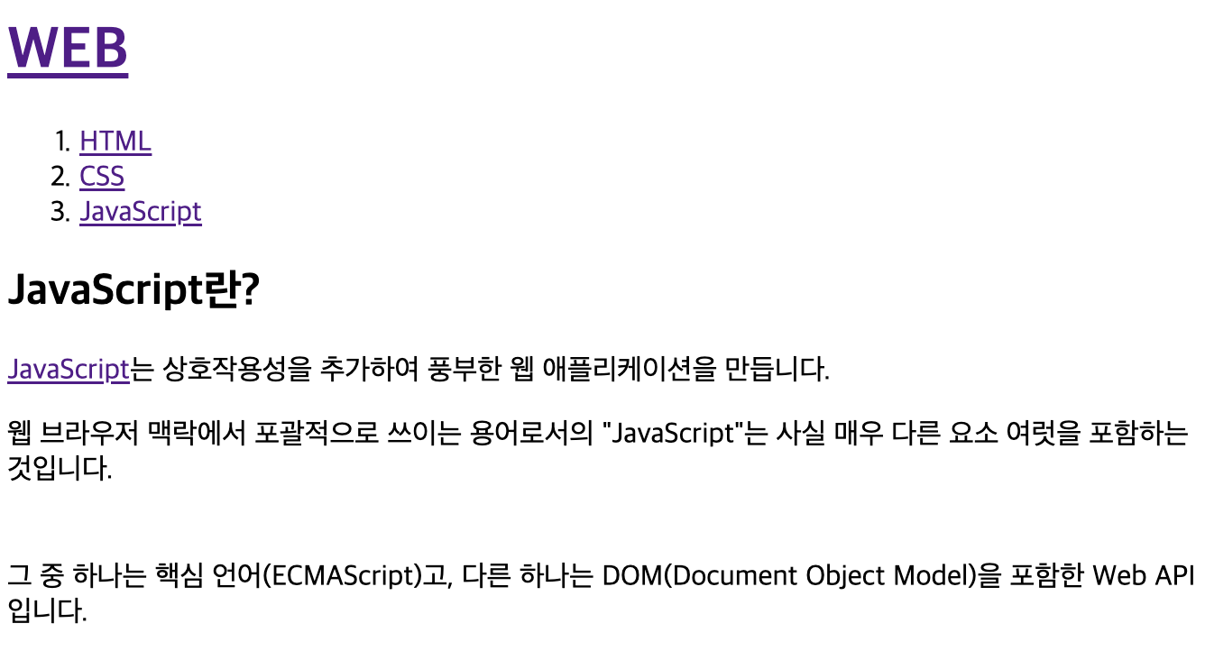 <p style="margin-top: 40px;">그 중 하나는 핵심 언어(ECMAScript)고, 다른 하나는 DOM(Document Object Model)을 포함한 Web API입니다.</p>