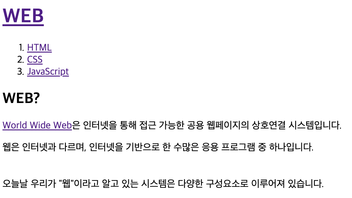 <p><a href="https://developer.mozilla.org/ko/docs/Glossary/World_Wide_Web" target="_blank" title="WEB specification">World Wide Web</a>은 인터넷을 통해 접근 가능한 공용 웹페이지의 상호연결 시스템입니다.