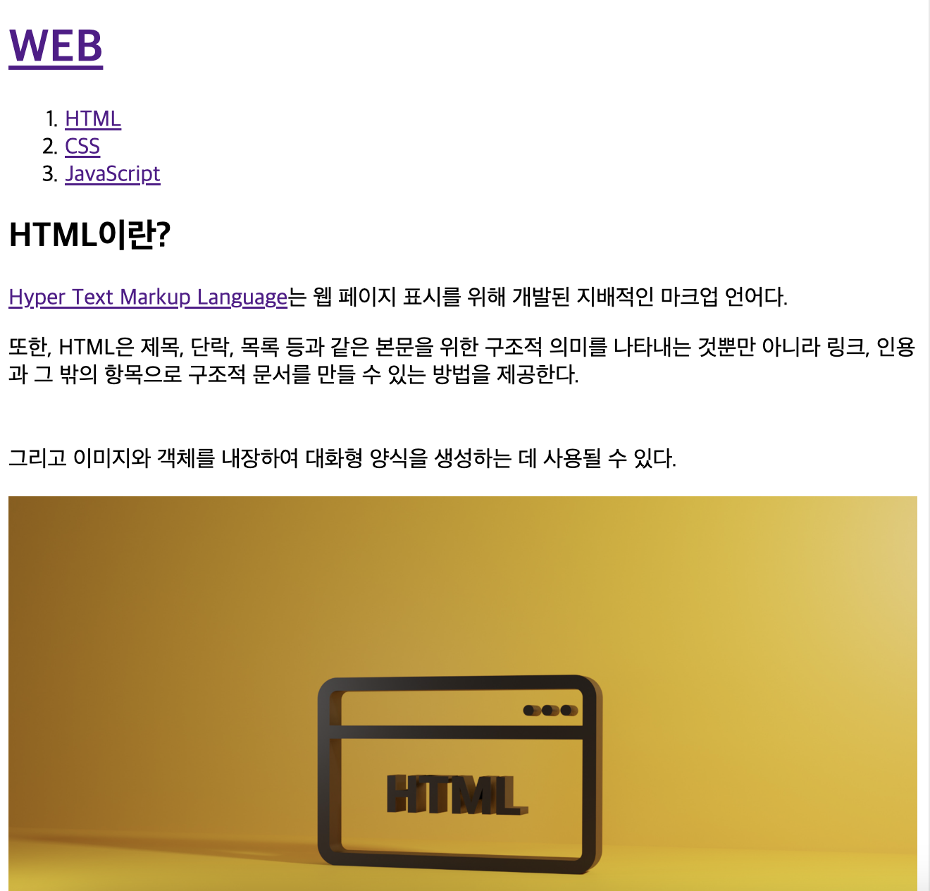 <p><a href="https://www.w3.org/TR/2011/WD-html5-20110405/index.html" target="_blank" title="html specification">Hyper Text Markup Language</a>는 웹 페이지 표시를 위해 개발된 지배적인 마크업 언어다.