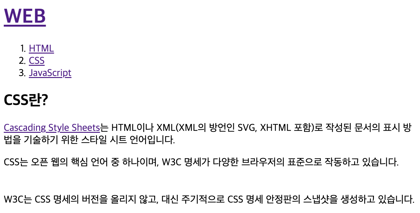 <p>CSS는 오픈 웹의 핵심 언어 중 하나이며, W3C 명세가 다양한 브라우저의 표준으로 작동하고 있습니다.</p>