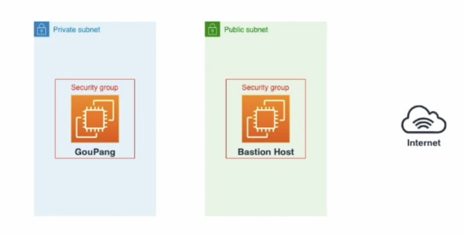 BastionHost는 SSH포트(22)만 열어두고, GouPnag은 SSH포트를 BastionHost의 보안그룹으로만 열어두게 됩니다. BastionHost에서는 SSH포트를 특정 IP만 열어주게된다면 더욱 안전한 구성이 가능합니다.