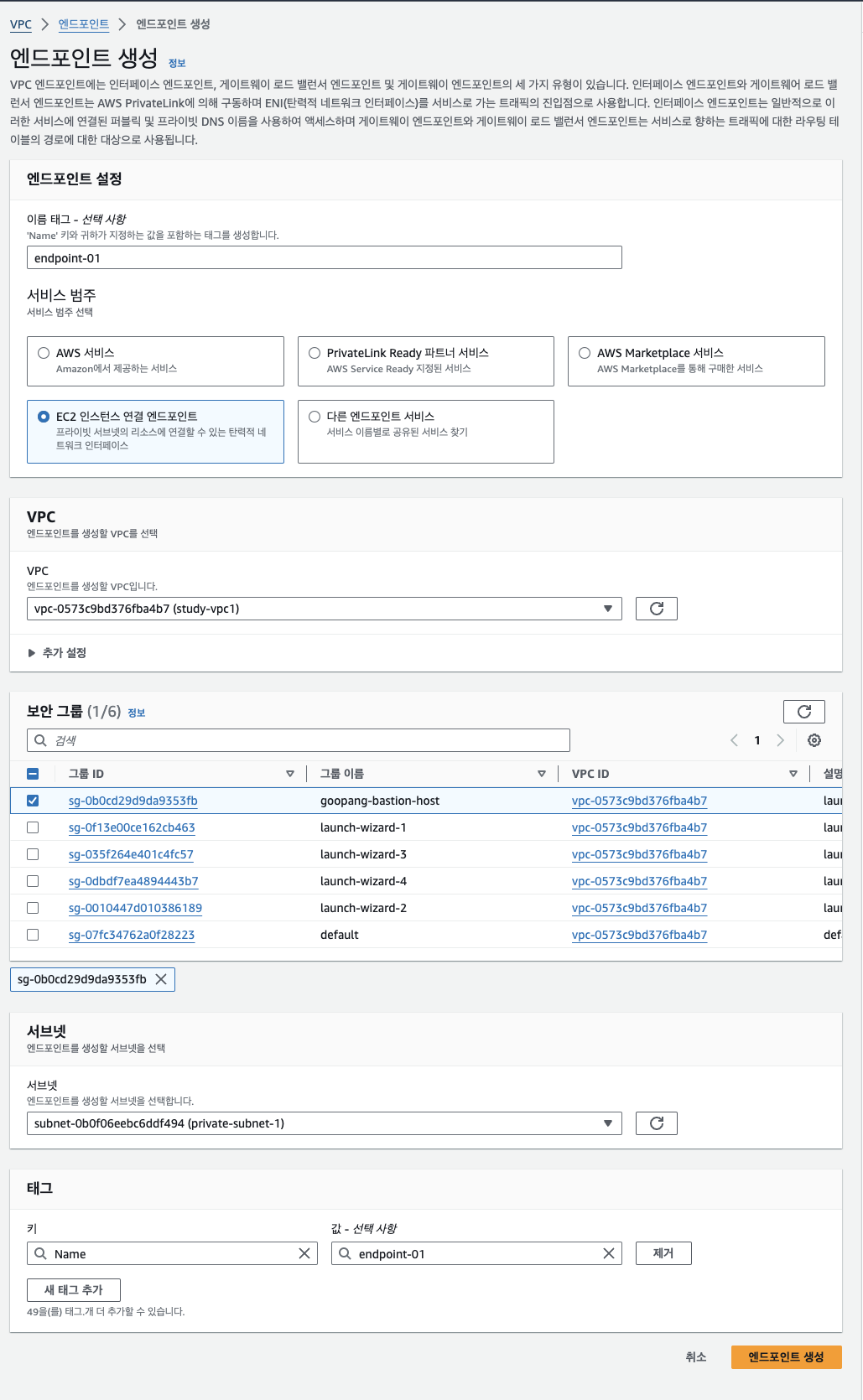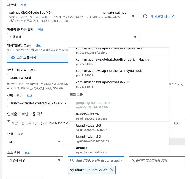 서브넷은 프라이빗, 퍼블릿 IP는 비활성화, ssh는 배스천에 보안그룹 타겟 지정