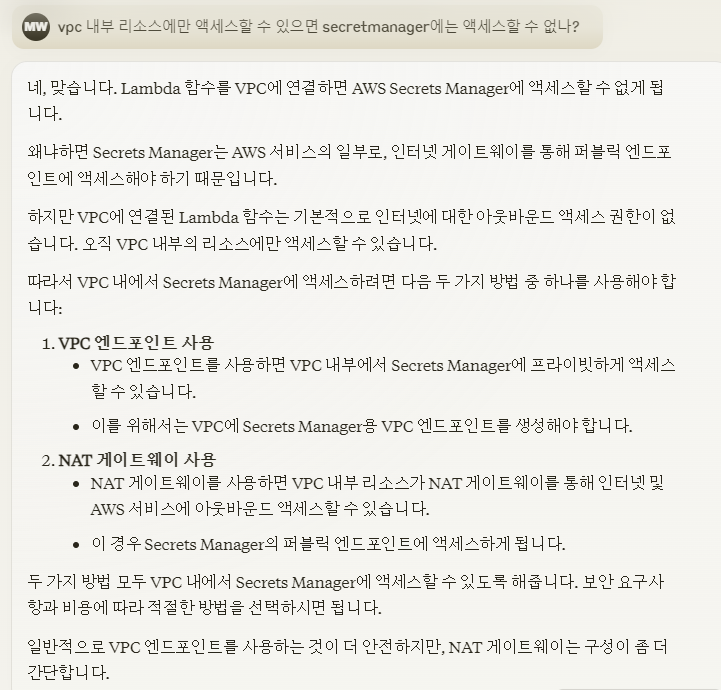 secrets_manager = boto3.client('secretsmanager', endpoint_url='https://vpce-XXXXXX33ffe0b2-xXXXXXX.secretsmanager.ap-northeast-2.vpce.amazonaws.com')