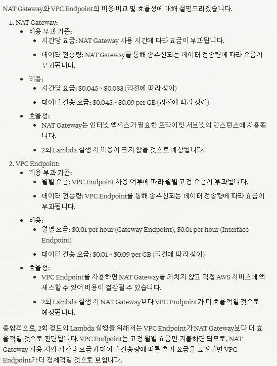 VPC에 속한 Lambda가 사용되려면 VPC Endpoint or Nat Gateway 가 필요하다.