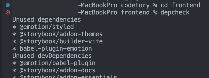 그 다음 프로젝트의 루트 디렉토리(package.json 이 있는 폴더)로 이동하고 depcheck을 실행시킨다